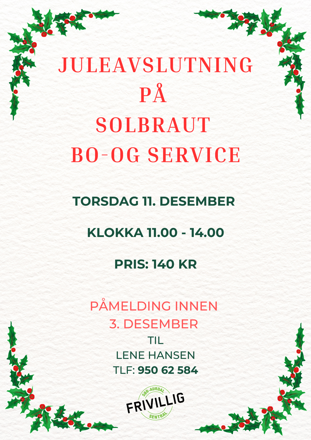 Sosialt julebord med påmeldingKom og bli med på en sosialt og trivelig juleavslutning på Solbraut bo og service
